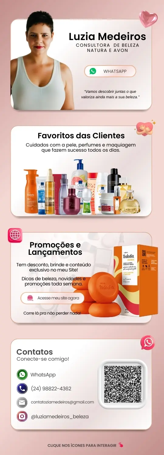 Seus contatos, redes sociais, endereço, portfólio, agendamento e muito mais, centralizados em um link.